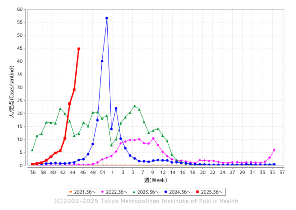 2025年10月時点で既に例年より前倒し流行が始まっており、過去20年で2番目の早さの流行入りとされています。